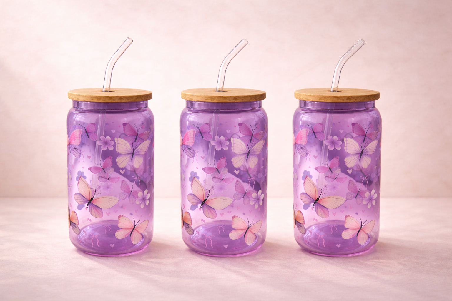 Dieses schlichte, farbenfrohe Trinkglas ist der perfekte Begleiter für jeden Tag. Es kommt als komplettes Set mit Bambusdeckel, Glasstrohhalm, Reinigungsbürste und einem Schmetterlings-Design, der dem Glas seinen ganz besonderen Look verleiht.